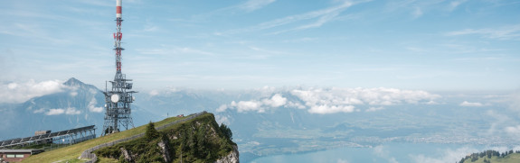Mit der Standseil- und der Gruppenumlaufbahn geht‘s von der Haltestelle Beatenbucht der Linie 21 hoch hinauf auf fast 2 000 Meter über Meer – zu einem der schönsten Aussichtspunkte am Thunersee, dem Niederhorn. Empfehlenswert ist die Wanderung mit einem fünfminütigen Umweg zu Beginn. Dieser führt von der Bergstation am Berghaus vorbei zur Aussichtsplattform, die eine wunderbare Rundsicht auf Thunersee, Alpenpanorama und Justistal bietet.