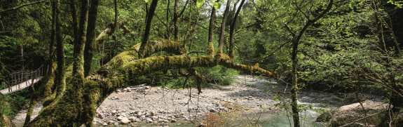 schmalen Waggelisteg hinein in das Waldstück am anderen Flussufer und